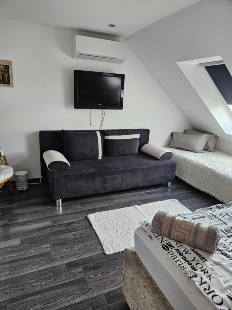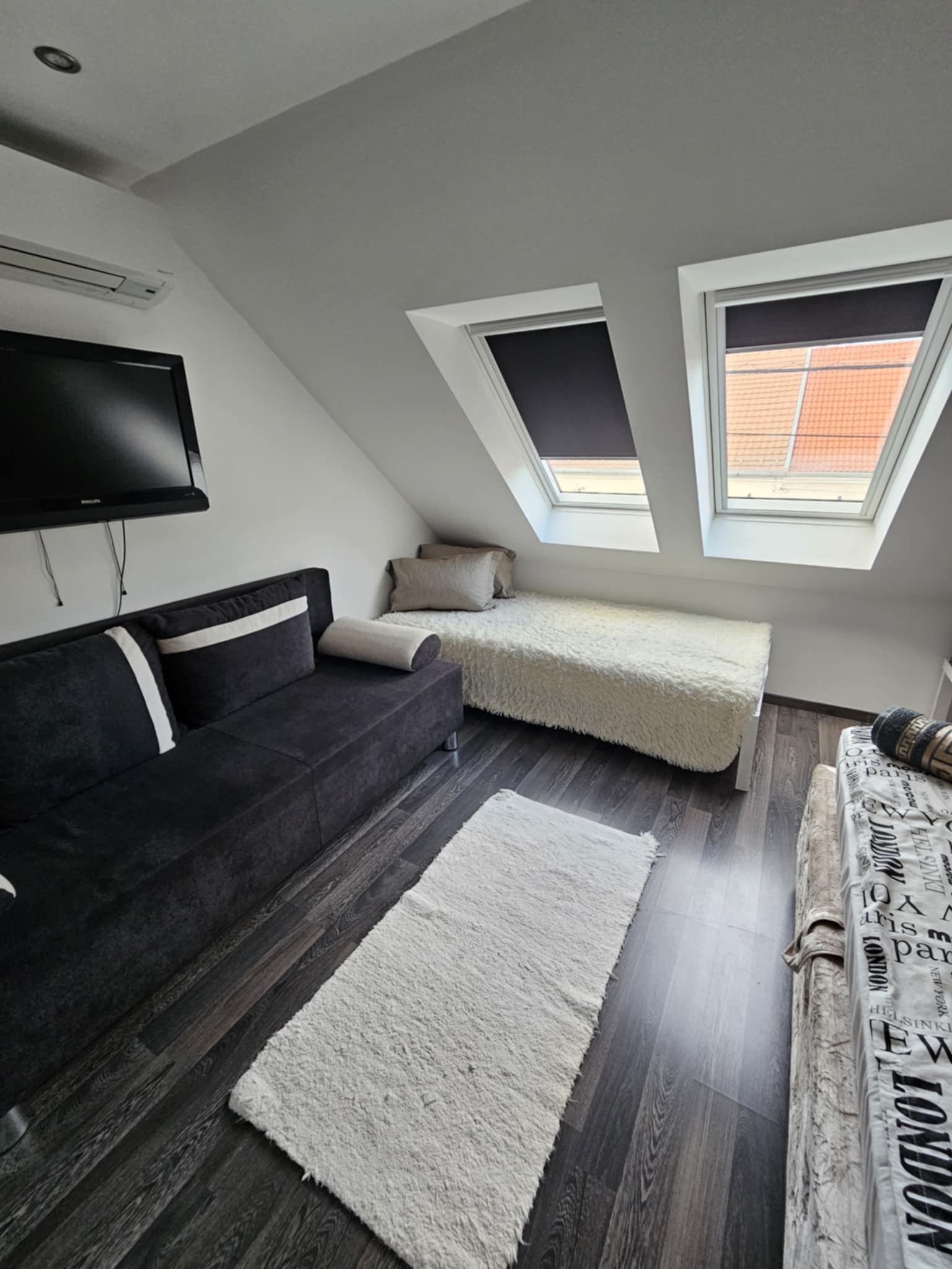 Az emeleti szoba ideális választás nagyobb társaságok, családok vagy baráti utazások számára, ahol fontos a tér, a kényelem és a nyugodt környezet. A szoba akár 5 fő elszállásolására is alkalmas, miközben megőrzi az apartmanra jellemző elegáns és letisztult stílust.